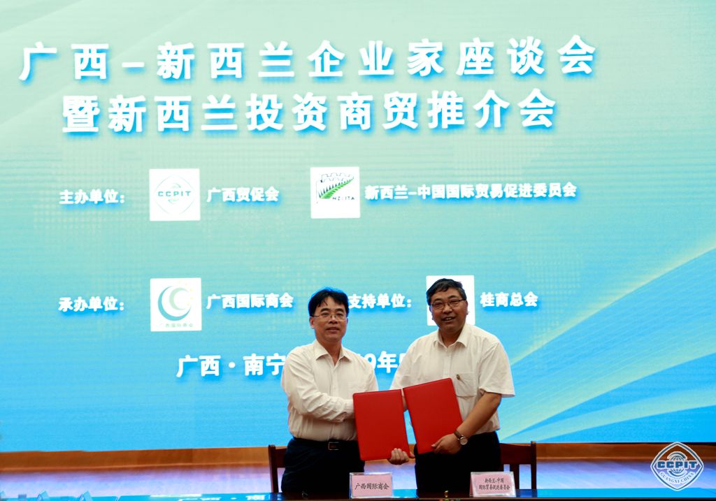 在推介会上,广西国际商会与新西兰—中国国际贸易促进委员会签署合作协议。新西兰太平洋文化艺术交流中心、新西兰蓝湾集团、新西兰瀚思国际有限公司、魔法灯集团等公司代表对本公司的业务、公司优势、主打产品、项目等进行了宣传推介,表达了开拓广西市场、寻找广西合作方的强烈愿景。