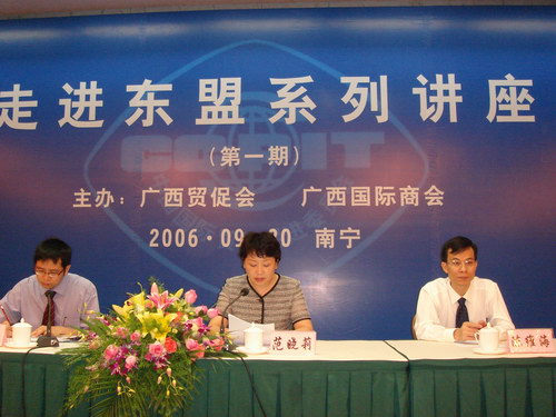 9月20日,广西贸促会、广西国际商会在南宁举办了“走进东盟系列讲座”(第一期),广西贸促会范晓莉会长出席了讲座并在开幕式上讲话,讲座由吴格飞秘书长主持。来自全区各市、各委员单位、副会长、理事单位、会员企业和有关部门的代表150多人出席了讲座。