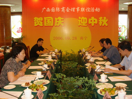 本次联谊活动邀请了中国银行广西分行国际部王永平总经理、中国人民财产保险股份有限公司广西分公司满东经理分别就企业所关心的中国银行国际结算及贸易融资产品等银行业务和风险管理、保险基本原理、财产保险主要险种、市场及监管等保险业务进行了讲解。联谊活动还安排了理事的业务交流,切磋企业发展战略和策略,互相之间获得了新的信息。最后,广西国际商会举行了宴会,整个活动在轻松、愉快的气氛中圆满结束。