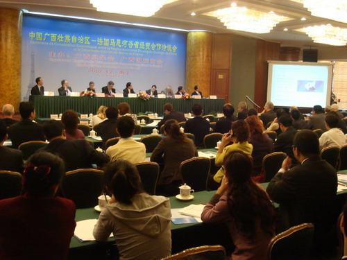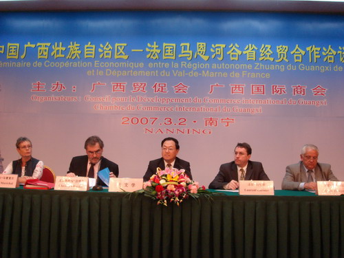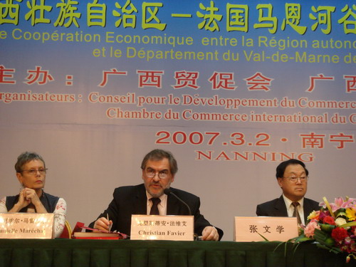 应广西贸促会邀请,法国第94省(马恩河谷省)省长克里斯蒂安•法维艾(Christian Favier)率领的经贸代表团一行26人,于3月2日—3日访问南宁。为增进相互了解和友谊,促进双方的经贸交流与合作,广西贸促会与法方于3月2日在南宁共同举办了“中国广西自治区—法国马恩河谷省经贸合作洽谈会”。洽谈会由广西贸促会林仰德副会长主持。自治区政协张文学副主席出席了洽谈会并作讲话。