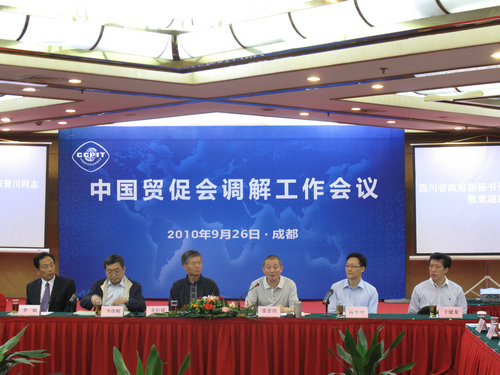 2010年9月26日,中国贸促会调解工作会议在成都召开。中国贸促会副会长、中国贸促会调解中心主席董松根、四川省政府副秘书长张晋川、最高人民法院司法改革办公室主任卫彦明等领导出席会议并致辞。来自全国58家贸促会地方及行业分支机构调解中心及四川省有关法院的代表120余人参加了会议。