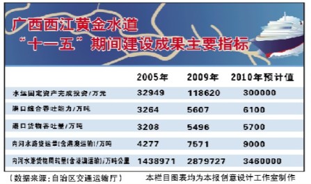 黄金水道,黄金效益。回看“十一五”,西江亿吨黄金水道建设不断深入,“两区一带”发展新格局逐渐形成;展望“十二五”,西江黄金水道和广西北部湾经济区的双翼展翅,进入江、海经济拉动我区快速发展的“双核”时代。