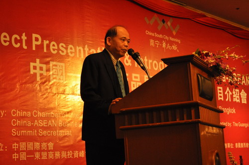 为协助香港华南城集团在南宁建立中国-东盟产品展示交易中心,全面推动泰国的招商招展工作,中国—东盟商务与投资峰会秘书处与香港华南城集团于7月22日在泰国曼谷举行了一场中国-东盟产品展示交易中心介绍会。我秘书处秘书长黄永强、香港华南城集团联席主席郑松兴、泰国总商会副主席培拉•布拉帕猜斯、泰华九属会馆代主席、泰国客家总会理事长邓干勋分别在会上讲话,泰国广西总会主席封嘉盛代表泰国方致辞。会议由泰国广西总会副主席梁忠翥主持,来自泰国广西总会、泰国中华总商会、泰中商务理事会、泰国总商会、泰国工业联盟等各大商协组织涉及制造业、服装、电力、橡胶、食品、糖业、物流等领域的会员企业250人出席。