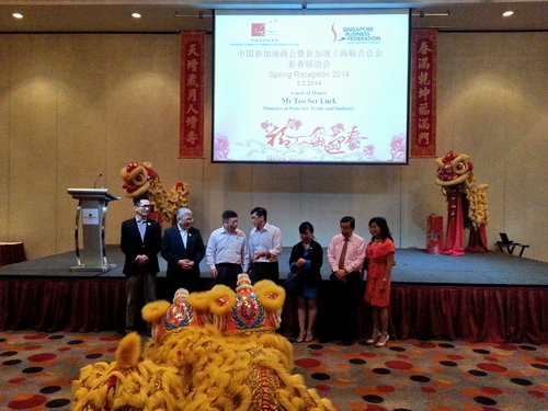 中国驻新加坡大使段洁龙(左三),新加坡贸工部政务部长张思乐出席(左四)、新加坡工商联合总会副主席傅春安(左二)、中国新加坡商会会长薛宝金(右三)等出席本次活动。