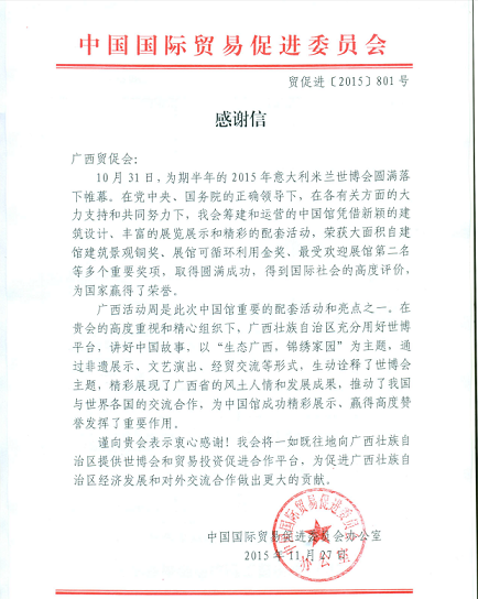 2015年11月27日,中国贸促会发来《感谢信》,对我会在2015年米兰世博会中国馆所做的工作给予充分肯定,并对我会为中国馆成功精彩展示、赢得高度赞誉发挥的重要作用表示衷心感谢。