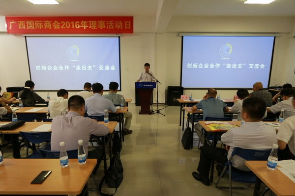 8月1日,广西国际商会2016年第二次理事活动日在南宁举行。广西国际商会副会长丁元龙出席活动并致辞。本次理事活动日以“创新企业合作‘走出去’”为主题,广西任意空间科技有限公司、广西南宁福海农业种植专业合作社介绍了“走出去”合作项目,交流经验;广西律师协会知识产权专业委员会主任韦文胜应邀讲解知识产权相关法律知识、案例分析;贺州市八步区南木村宣传推介了扶贫合作项目。会后,与会代表参观了企业产品、项目展示,交流洽谈气氛热烈,项目对接富有成果。
