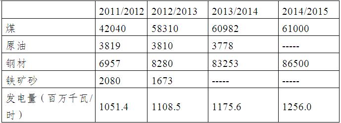 【工业】 主要工业包括纺织、食品加工、化工、制 药、钢铁、水泥、采矿、石油和机械等。汽车、电子产品制造、航空和空间等新兴工业近年来发展迅速。2008年以来,印工业增长放缓,2013/2014年,工业同比增长0.4%,其中采矿业下降1.4%,制造业下降0.7%。2014/2015年(4月至1月),印度工业生产指数同比增长2.5%。电力行业同比增长9.3%,在三大主要行业中增长最快。制造业和采矿业分别同比增长1.7%和1.3%。近年来主要工业产品产量如下(单位:万吨):