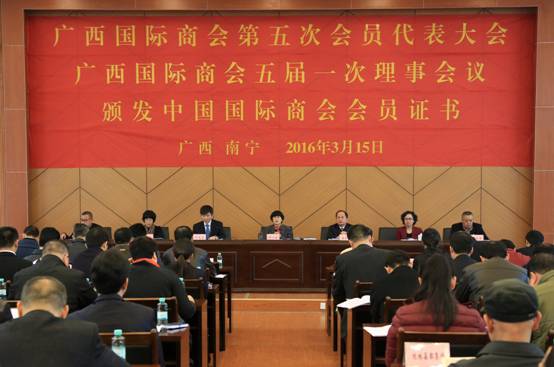 3月15日,广西国际商会第五次会员代表大会、广西国际商会五届一次理事会议在南宁隆重召开。会议总结了第四次会员代表大会以来的工作,选举产生了新一届的理事会领导机构,表决通过了《广西国际商会章程》修正案,研究和部署了第五届理事会工作,颁发了中国国际商会会员证书。企业副会长、理事代表在会上作了交流发言。