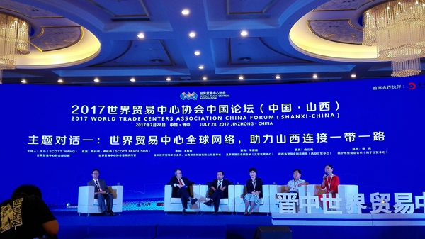 谭漓会长受邀出席论坛开幕式并在主题对话“世界贸易中心全球网络,助力山西连接一带一路”中发言,与各世贸中心代表就山西如何更好接入“一带一路”进行讨论。