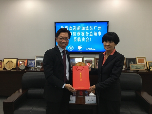 2月22日上午,何小玲会长在我会会见新加坡驻广州总领事馆总领事蔡簦合一行。双方就如何加强合作,推动中新经贸合作发展交换意见。