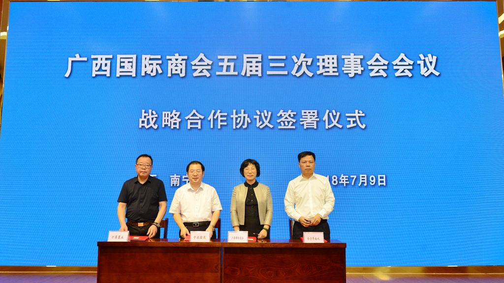 会议还举行了签约仪式。广西国际商会与南宁华南城有限公司、北京中农富通园艺有限公司广西分公司、广西玉林万昌置业投资有限公司签署了战略合作协议。