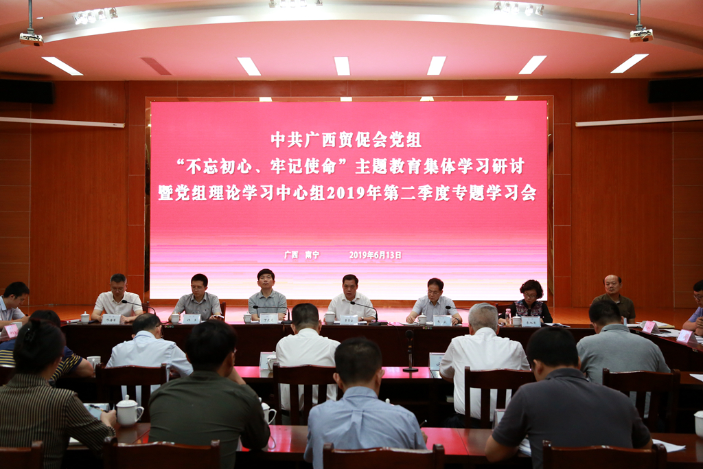 6月13日上午,广西贸促会党组书记、会长李常官主持召开中共广西贸促会党组“不忘初心、牢记使命”主题教育集体学习研讨暨党组理论学习中心组2019年第二季度专题学习会,学习习近平总书记在“不忘初心、牢记使命”主题教育工作会议上的讲话精神和自治区党委书记鹿心社在全区主题教育工作会议上的讲话精神,部署广西贸促会开展主题教育有关工作,自治区党委主题教育第五巡回指导组组长韦良同志到会指导并讲话。