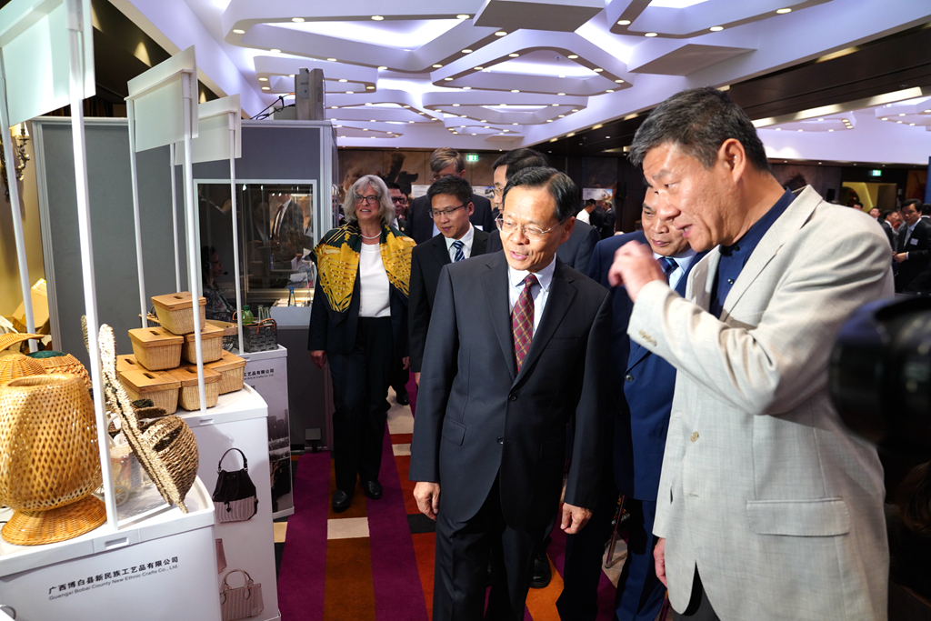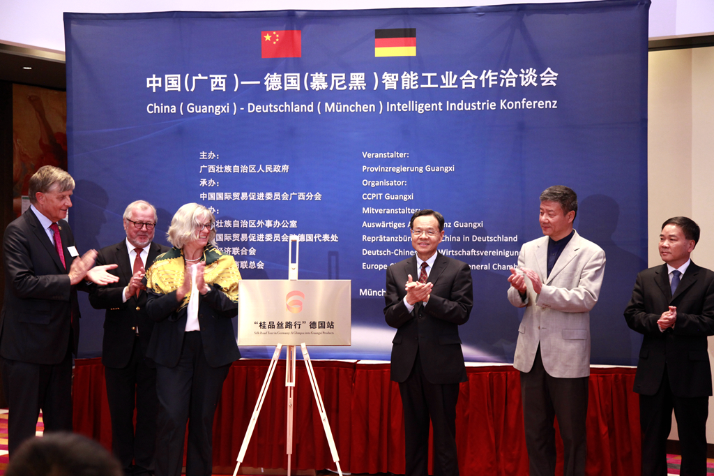 6月18日,“桂品丝路行”德国站在中国(广西)—德国(慕尼黑)智能工业合作洽谈会上启动。自治区人民政府主席陈武、中国驻慕尼黑总领事张越、自治区人民政府秘书长黄洲、德中经济联合会会长白希可、巴登符腾堡州前经济部部长邵夫乐、中国国际促进中心(德国)高级顾问博喜文博士共同为“桂品丝路行”德国站揭牌。