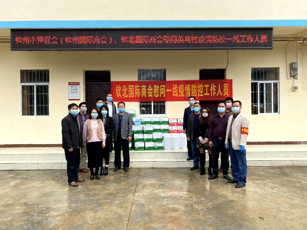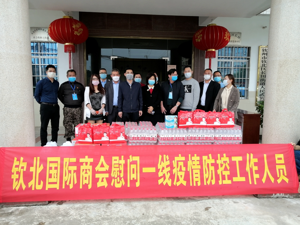 为贯彻落实习近平总书记关于坚决打赢新冠肺炎疫情防控阻击战的重要指示精神和党中央、国务院、自治区以及市委、市政府系列决策部署,落实市委组织部《关于组织市直机关企事业单位党组织配合社区做好新型冠状病毒感染的肺炎疫情防控工作的通知》精神,筑牢疫情防控防线,保障人民群众身体健康和生命安全,2月13日-14日,钦州市贸促会(国际商会)结合“双报到,双服务”等活动,组织钦北国际商会会员企业及党员代表先后赴扶贫挂点村东场镇英窝村、钦北区长田街道城北社区慰问疫情防控一线工作人员,给一线同志加油鼓劲。