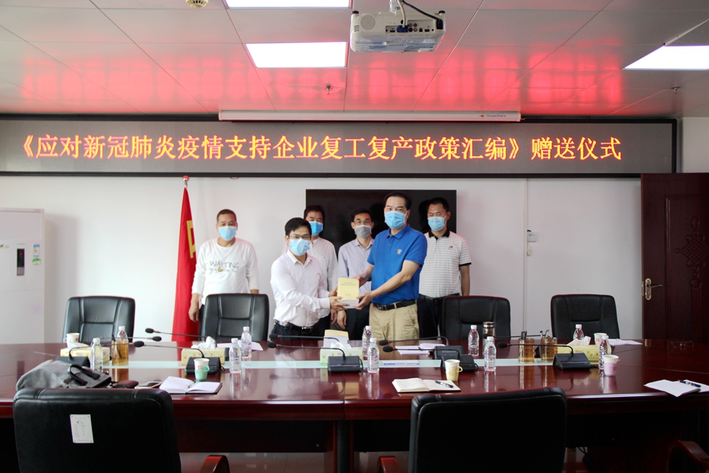 钦州市贸促会黄杏鼎副会长、钦州市投资促进局利贵世副局长分别向与会企业代表赠送《应对新冠肺炎疫情下全力支持企业复工复产工作政策汇编》,解读相关政策,帮助企业积极应对疫情下经营发展难题。
