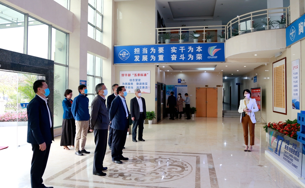 自治区政府副秘书长杨斌陪同调研,广西贸促会班子成员、各部室负责人参加工作座谈会。