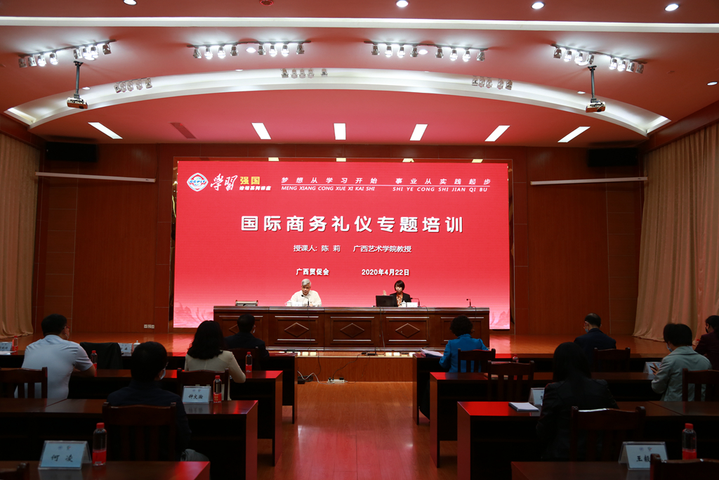 4月22日下午,我会举办2020年广西贸促会“学习强国”论坛系列讲座之一:国际商务礼仪专题培训。讲座邀请了国家二级心理咨询师、国家高级礼仪培训师、国家高级礼仪(礼宾)师、全国专业人才教育专家委员会礼仪委员、广西艺术学院陈莉教授到会授课。