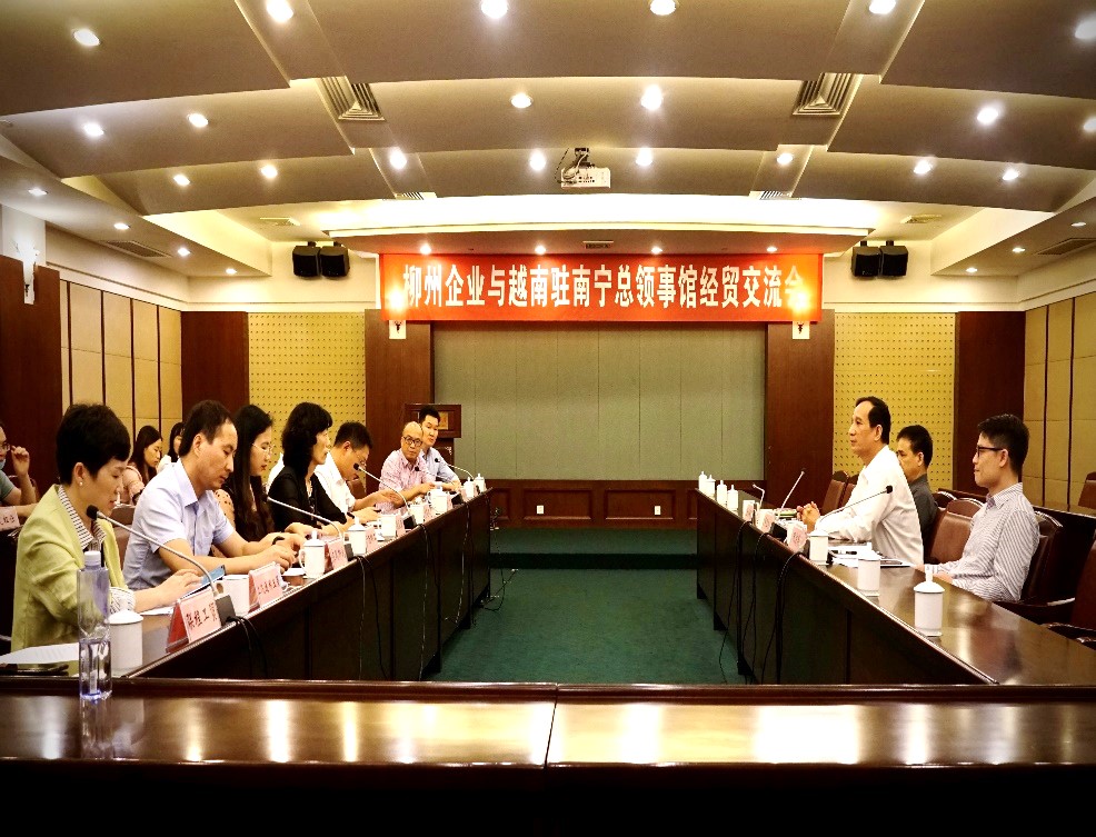 5月13日下午,由越南驻南宁总领事馆、中国国际贸易促进委员会柳州市支会和柳州市外事办共同举办的柳州企业与越南驻南宁总领事馆经贸交流会在柳州饭店举行。越南驻南宁总领事馆总领事及领事,柳州市贸促会、市外事办、广西广播电视台北部湾之声,广西柳工机械股份有限公司、东风柳州汽车有限公司、上汽通用五菱汽车股份有限公司、柳州联程工贸有限公司、柳州市国际经济技术合作有限公司、柳州市祺沛贸易有限责任公司、柳州市绿榕汽车玻璃有限公司的业务负责人以及新闻媒体代表参加会议。