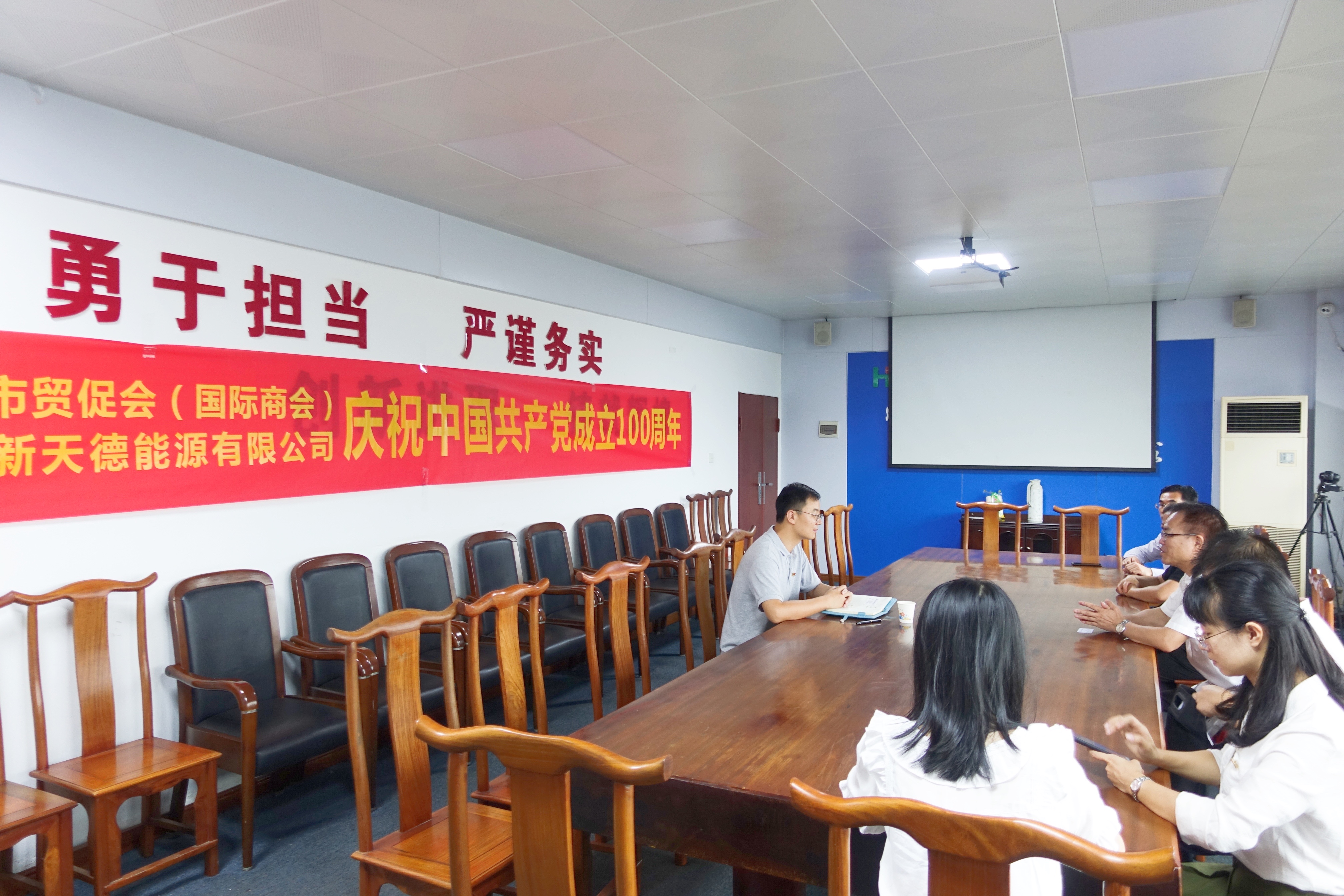 钦州市贸促会党员干部职工首先走访了贸促会自贸区办事处,与办事处负责同志以及工作人员交流座谈,了解办事处日常工作开展情况。市贸促会会长黄应增强调自贸区办事处作为贸促会服务自贸区建设的前沿阵地,要以党史学习教育为契机,真正把贸促工作前移,克服各种困难,扎实服务好自贸区企业。座谈交流后,市贸促会深入会员企业——广西新天德能源有限公司调研,与公司开展“民族团结进步创建•夏日送清凉活动”,为公司职工送去清凉饮料等慰问品,共同庆祝建党一百周年。