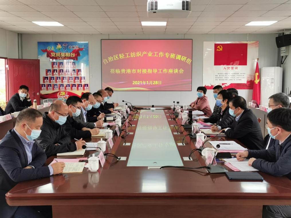 1月27-28日,自治区轻工纺织产业集群工作专班召集人、自治区人大常委会副主任杨静华率队,赴贵港市中国(贵港)纺织服装时尚新区开展专题调研。自治区人大常委会副秘书长宋震寰,自治区人大常委会委员、外侨委副主任委员梁崎峰,广西贸促会会长李常官、副会长伍娟、秘书长邓诗军参加调研。参加调研的还有自治区工业和信息化厅、投资促进局,贵港市政府、人大及各有关单位负责人等。