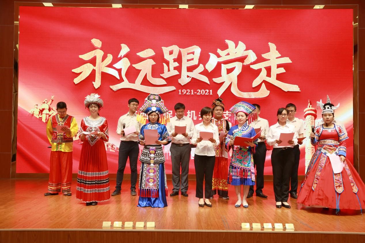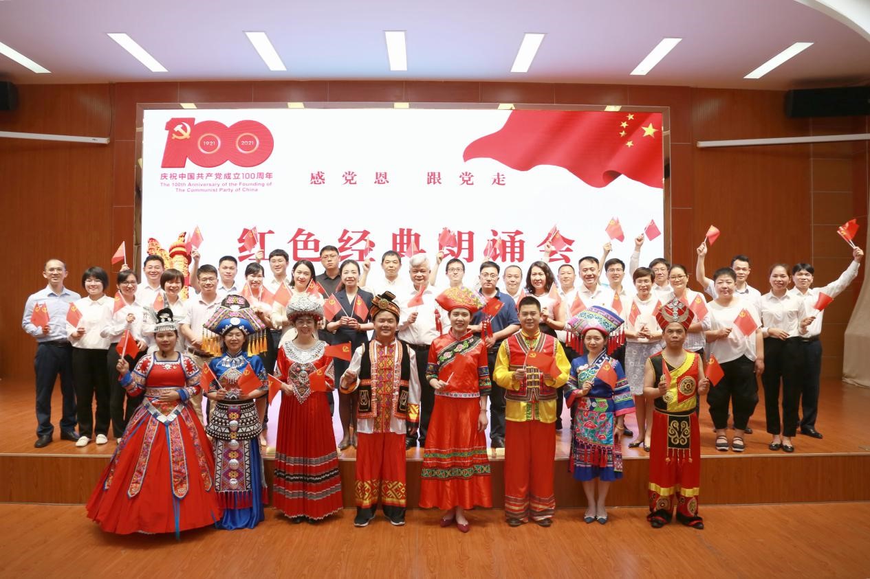 朗诵会上,干部职工以部室、支部为单位,分别朗诵了《共产党宣言》、《牢记初心使命,走好新时代长征路》、《红船从南湖起航》、《党啊,我的母亲》、《为人民服务》、《沁园春•雪》等十余首诗歌及红色经典作品,他们用慷慨激昂、声情并茂的朗诵,表达对祖国的热爱之情、对中国共产党的赤诚之心。通过诵读红色经典,配合图片、音乐、视频等多种形式,全体干部重温了中国共产党成立100年来艰苦卓绝的风雨历程,怀缅革命先烈不畏困难、不惧牺牲,心系家国、舍生取义的家国情怀,阐述中国共产党为什么“能”、马克思主义为什么“行”、中国特色社会主义为什么“好”。少数民族干部在朗诵会上发挥民族特色,表达了共促民族团结进步,永远跟党走的坚定信念。最后,全体干部激情昂扬地合唱《没有共产党就没有新中国》,把广大人民群众对中国共产党的衷心拥护和无限热爱之情展现得淋漓尽致,澎湃嘹亮的歌声响彻会场,把朗诵会推向高潮。