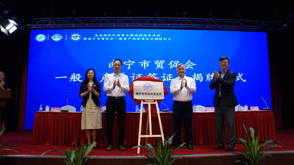 南宁市委常委、副市长王群(左二),广西贸促会二级巡视员方旗(右二)为南宁市贸促会一般原产地证签证点揭牌,中国贸促会法律事务部副部长舒寰(左一)见证揭牌仪式。