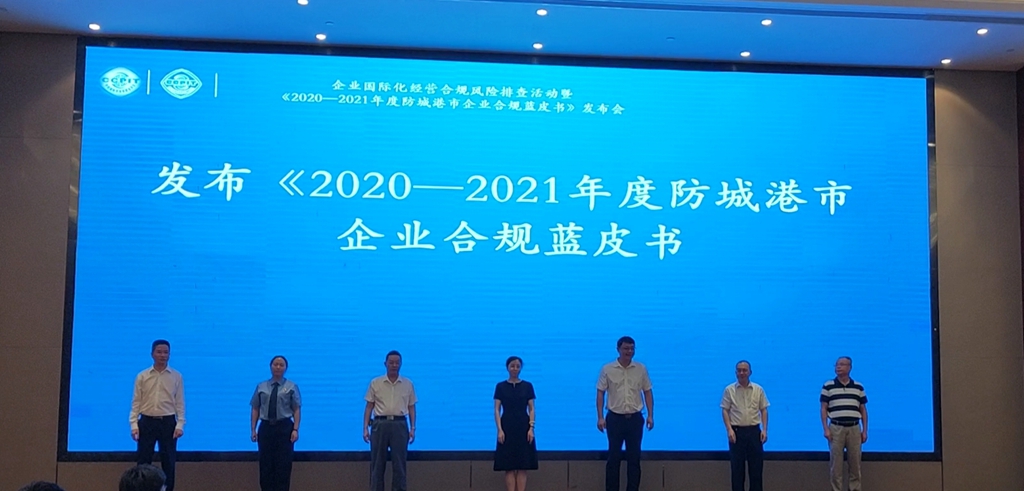 中国贸促会法律事务部副部长舒寰(左四)出席《2020-2021年度防城港市企业合规蓝皮书》发布会。