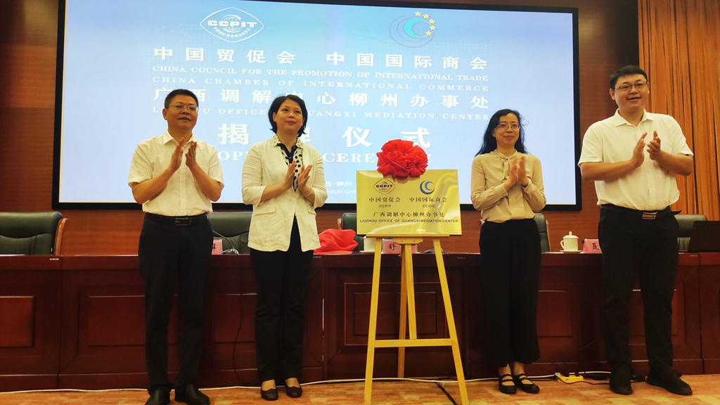 中国贸促会法律事务部副部长舒寰(右二),柳州市副市长卢柳屏(左二)为中国贸促会/中国国际商会广西调解中心柳州办事处揭牌。