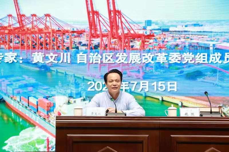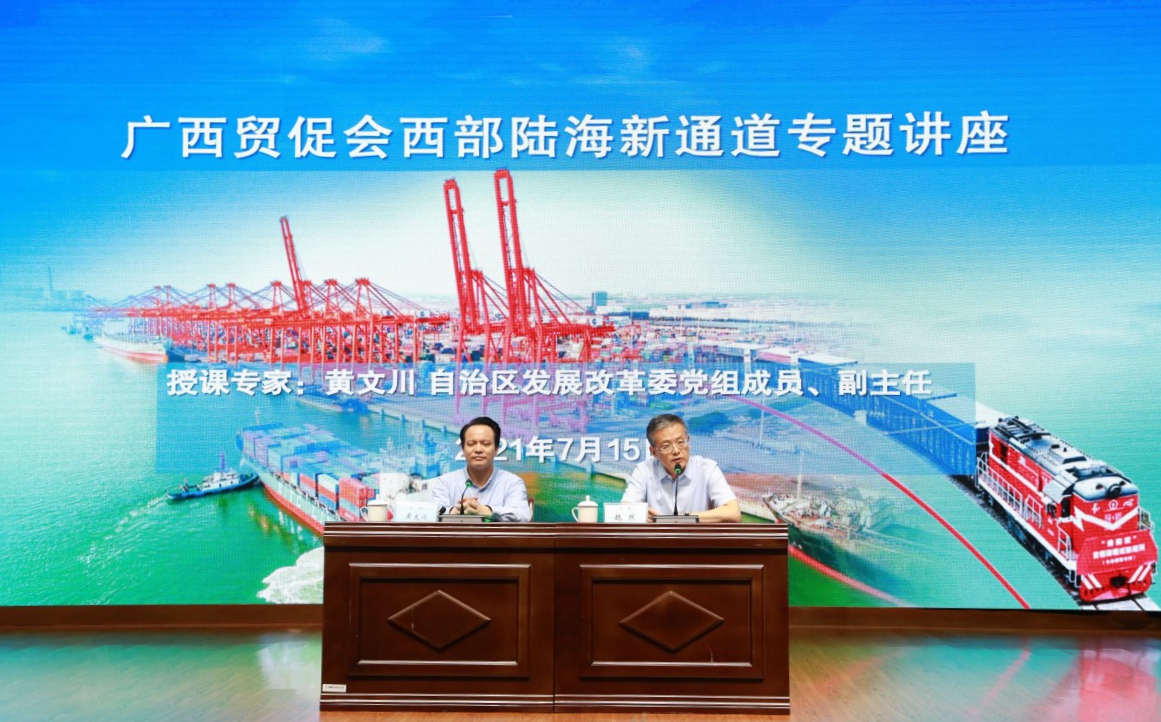 2021年7月15日上午,我会举办全区贸促系统西部陆海新通道专题讲座,邀请自治区发改委党组成员、副主任,西部陆海新通道建设指挥部办公室副主任黄文川同志到会授课。讲座采取线上线下结合方式,由魏然会长主持,区贸促会机关全体干部及各市、行业贸促会参加讲座。黄文川副主任系统介绍了西部陆海新通道发展现状及趋势、国家相关政策、广西的新发展机遇等相关情况,并就未来加快新通道建设提出了建设性意见。通过学习,全区贸促系统干部职工对西部陆海新通道国家战略有了较为全面和深入的了解,增强凝聚了贸促合力,发挥对外交流优势,提升了更好参与和服务西部陆海新通道建设的信念和信心。