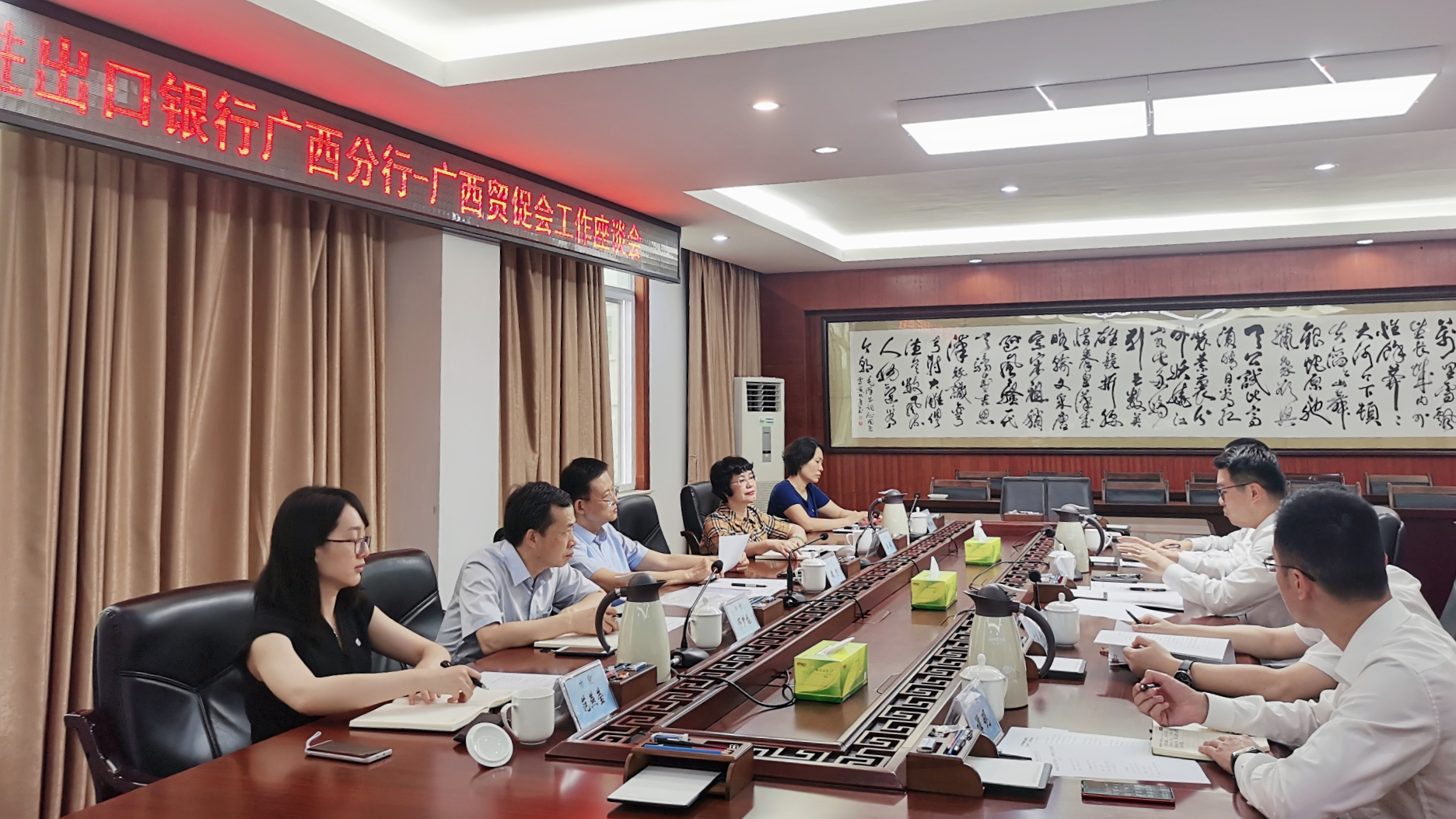 6月20日,广西贸促会党组书记、会长魏然会见中国进出口银行广西分行行长彭豪一行并座谈。