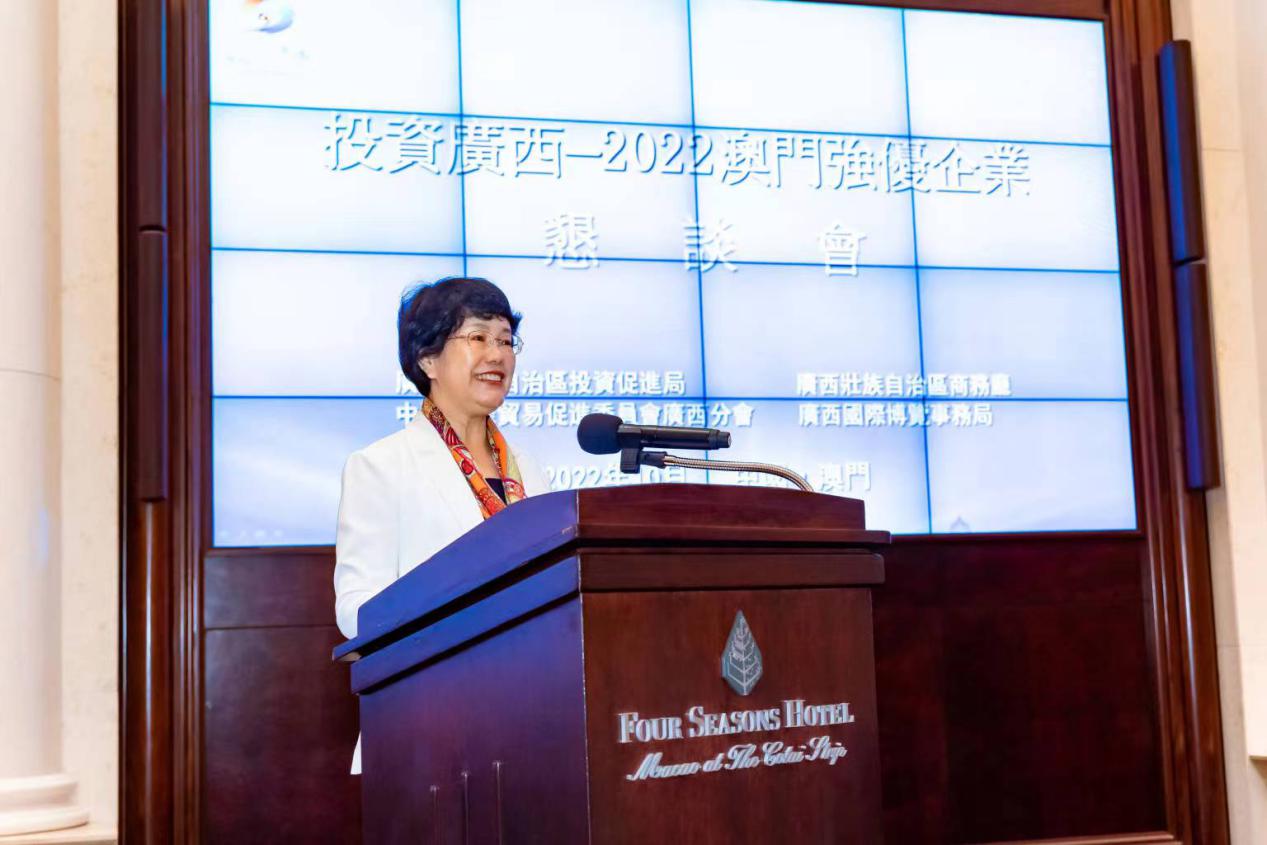 为深入贯彻落实党的二十大精神,主动对接粤港澳大湾区等国家重大战略,10月21日,由自治区投资促进局、自治区商务厅(自贸办)、广西贸促会、广西博览局主办的“投资广西——2022澳门强优企业恳谈会”在澳门成功举办。澳门付货人协会、南光医疗管理有限公司、澳门质量品牌国际认证联盟、珠澳跨境进出口零售业商会等70多家生物医药、商贸物流、大健康企业高管和重点行业商协会负责人参加会议。会议由自治区商务厅二级巡视员窦锡林主持,我会党组成员、副会长伍娟出席并致辞。
