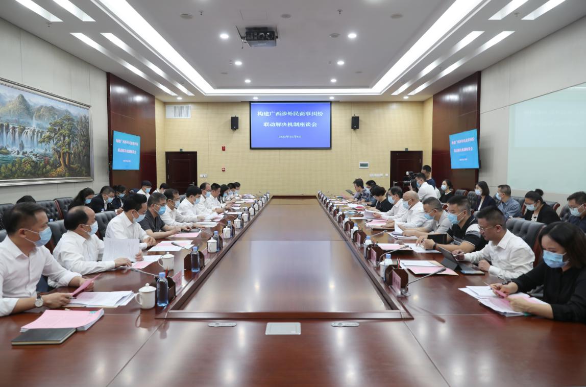 2022年11月9日,自治区高级人民法院与广西贸促会联合召开构建广西涉外民商事纠纷联动解决机制工作座谈会,深入学习贯彻党的二十大精神和习近平法治思想,落实统筹推进国内法治和涉外法治要求,研究构建专业化、国际化、多元化的广西涉外民商事纠纷联动解决机制,公正高效便捷、低成本解决涉外民商事纠纷,助力打造一流市场化、法治化、国际化营商环境,服务我区更高水平的对外开放,服务中国—东盟自由贸易区3.0版建设和RCEP协定实施。自治区高级人民法院党组书记、院长黄海龙出席座谈并讲话,自治区高级人民法院卢上需副院长、梁月奎副院长,广西贸促会伍娟副会长参加座谈并发言。