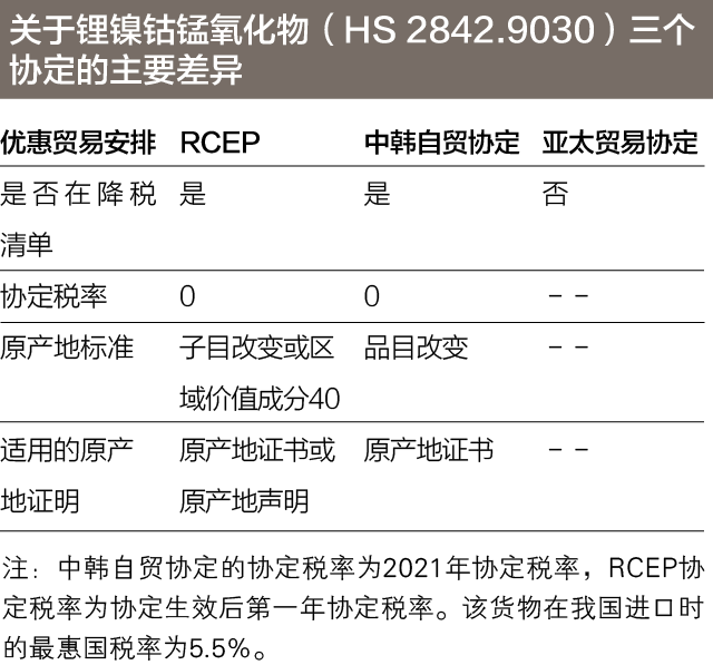 以我国自韩国享惠进口的主要货物锂镍钴锰氧化物为例,该货物在RCEP、中韩自贸协定、亚太贸易协定三项协定项下的适用情况、降税水平及原产地规则的主要差异详见下表。