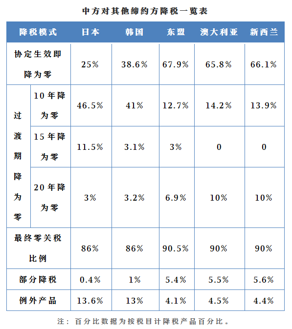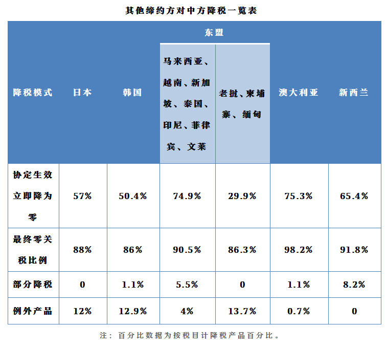 一类是“统一减让”,即同一产品对其他缔约方适用相同的降税安排,澳大利亚、新西兰、马来西亚、新加坡、文莱、柬埔寨、老挝、缅甸等8个缔约方都是这种模式,这些缔约方只有一张关税承诺表,即RCEP项下原产于不同缔约方的同一产品,在上述缔约方进口时,都将适用相同的税率。