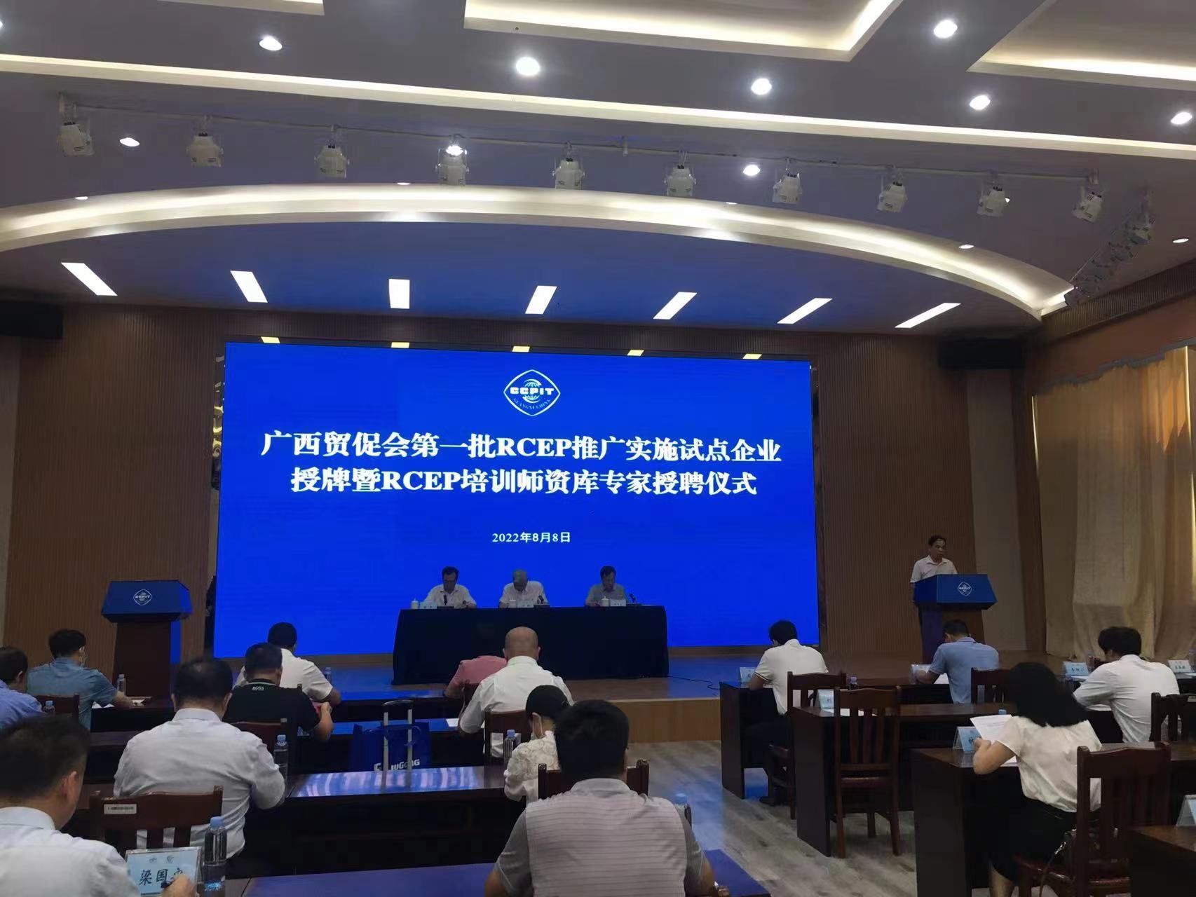 为加快推进RCEP在我区落地见效,帮助企业精准用好RCEP规则,同时加强RCEP培训工作,广西贸促会于8月8日举办第一批RCEP推广实施试点企业授牌暨RCEP培训师资库专家授聘仪式。8家第一批RCEP推广实施试点企业及其所在市贸促会,以及在邕的RCEP培训师资库专家参加了仪式。