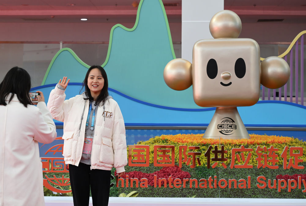 参观者在摆放着链博会吉祥物“链氪”标识的花坛前留影(2023年11月29日摄)。新华社记者 李贺 摄