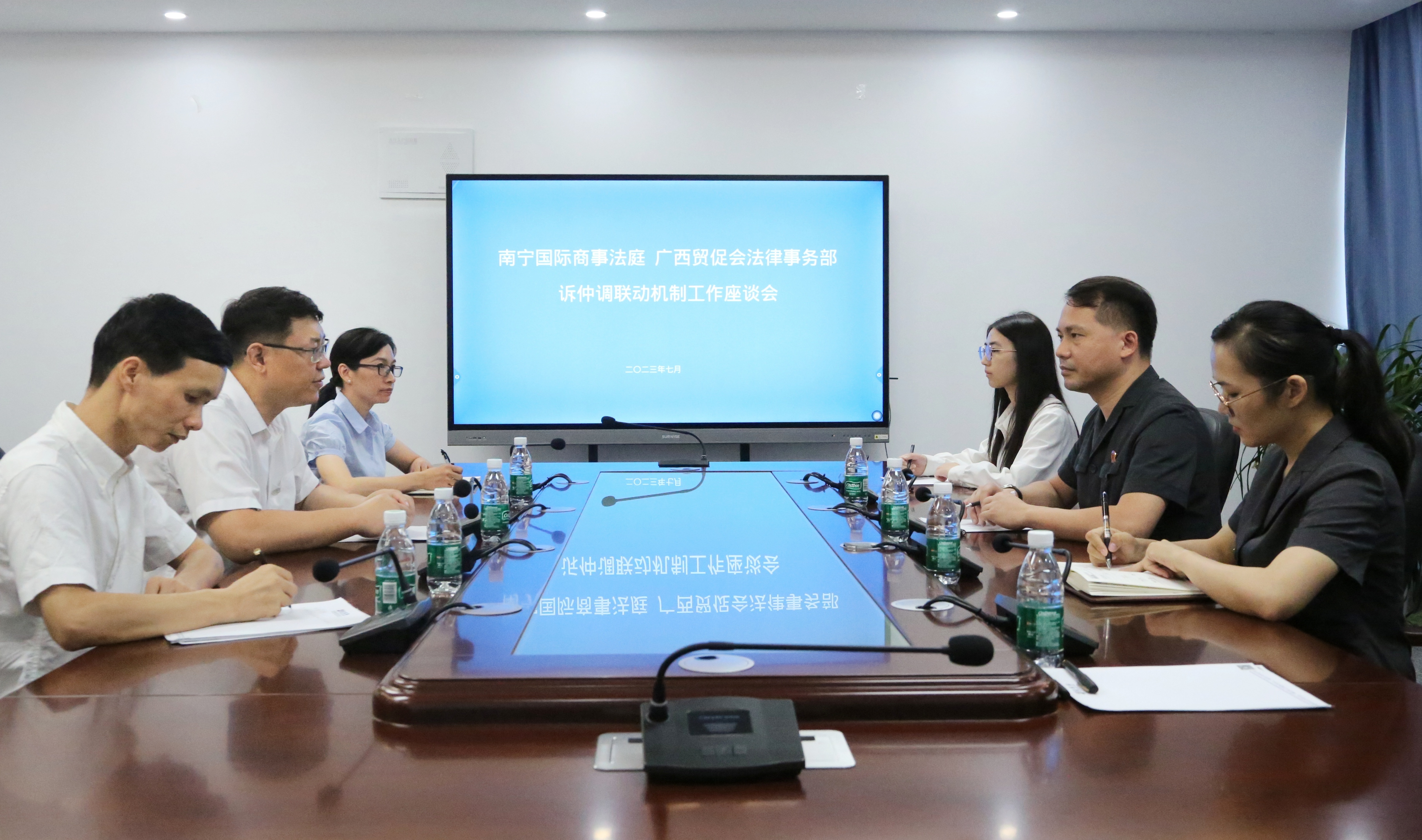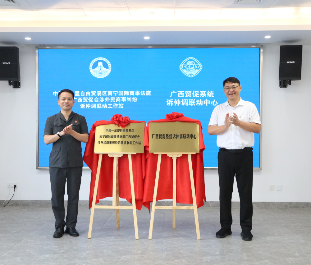 为推动构建广西涉外民商事纠纷联动解决机制落地见效,合力打造诉仲调“一站式”多元解纷平台,2023年7月20日,中国—东盟自由贸易区南宁国际商事法庭在广西贸促会设立全区首个涉外民商事纠纷诉仲调联动工作站,并与广西贸促系统诉仲调联动中心共同举行揭牌仪式。