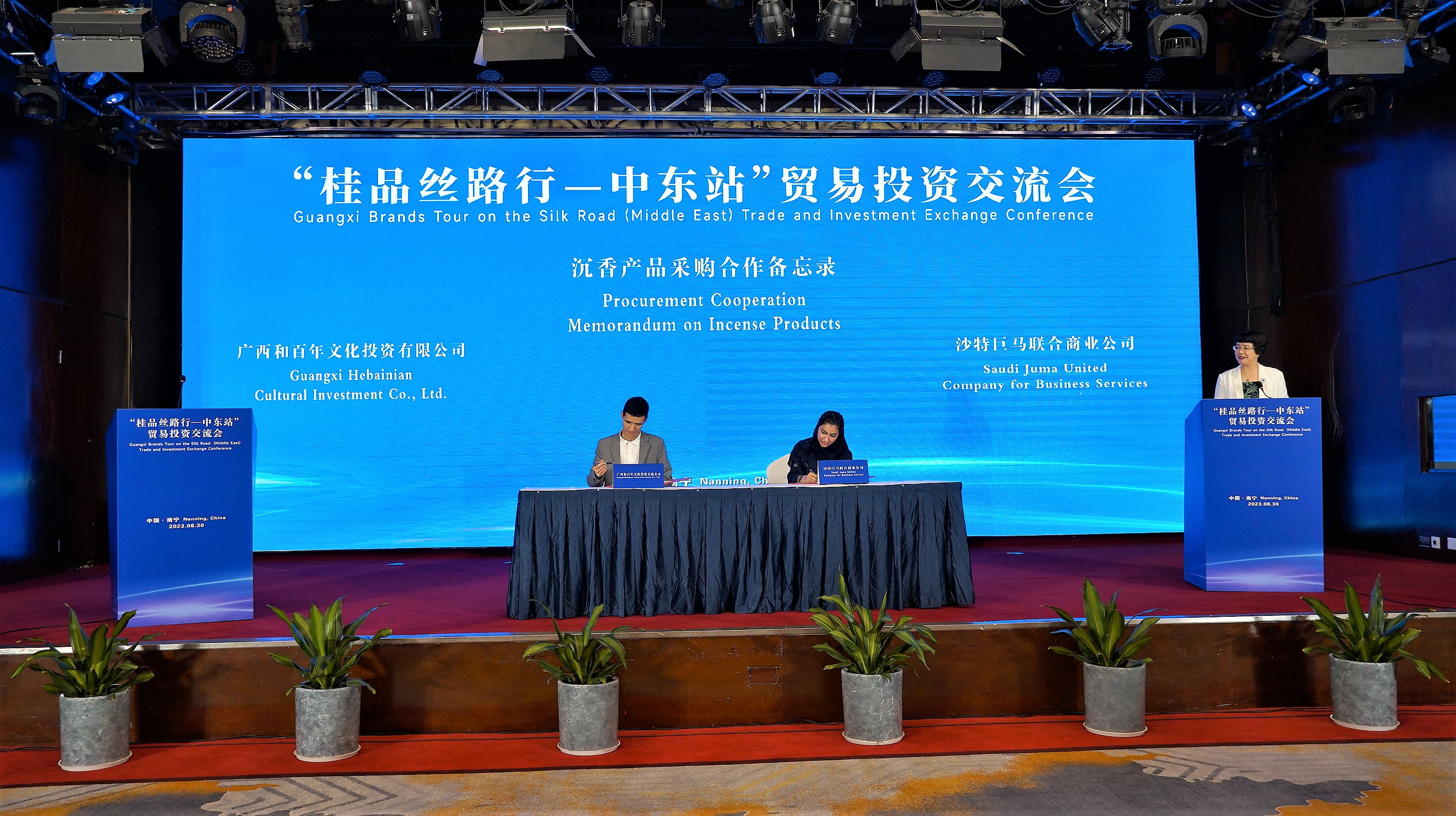 本次交流会共推动2个项目签约。第一个是沉香产品采购项目,沙特巨马联合商业公司拟向广西和百年文化投资有限公司采购一批沉香精油、沉香熏香原材料产品,合同采购金额为10.8亿元。第二个项目是跨境电商综合试验区项目,广西跨境电子商务协会与迪拜联合国际签订《广西民华跨境电商科技产业园与中东跨境电子商务综合试验区战略合作备忘录》。