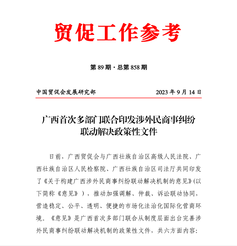 日前,广西贸促会与广西壮族自治区高级人民法院、广西壮族自治区人民检察院、广西壮族自治区司法厅共同印发了《关于构建广西涉外民商事纠纷联动解决机制的意见》(以下简称《意见》),推动加强调解、仲裁、诉讼联动协同,营造稳定、公平、透明、便捷的市场化法治化国际化营商环境。《意见》是广西首次多部门联合从制度层面出台完善涉外民商事纠纷联动解决机制的政策性文件,共六方面内容: