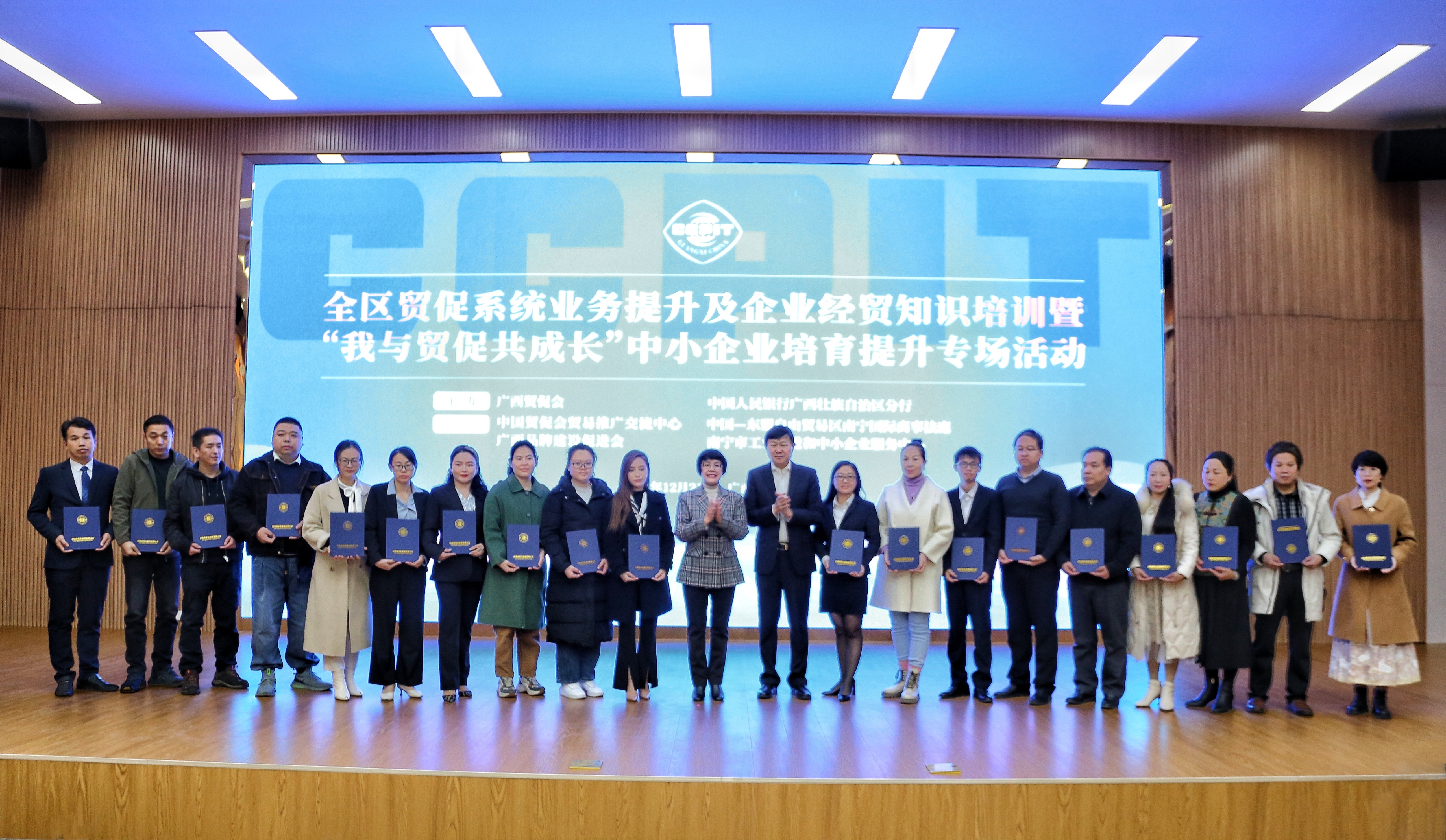 12月21日,由广西贸促会、人民银行广西壮族自治区分行共同主办,中国贸促会贸易推广交流中心、中国—东盟自由贸易区南宁国际商事法庭、广西品牌建设促进会、南宁市工业促进和中小企业服务中心协办的全区贸促系统业务提升及企业经贸知识培训暨“我与贸促共成长”中小企业培育提升专场活动在南宁举办。活动宣读了授权广西贸促会开展企业信用服务业务的批复,为桂林南药股份有限公司、广西自贸区泛东国际供应链集团有限公司等首批21家认证企业颁发信用、品牌认证证书,邀请相关领域和金融机构专家就贸促信用品牌融合认证服务、广西征信融资服务平台、跨境贸易结算与风险防控等内容进行政策解读和业务宣介,引导企业扩大对外交流合作,提升国际经营能力,擦亮企业品牌和信用名片,加快广西品牌国际化发展。来自全区各市新材料、供应链、工程机械、医疗器械、跨境电商、生物制药、农业食品等领域企业负责人和行业协会、商会共约150名代表参加。