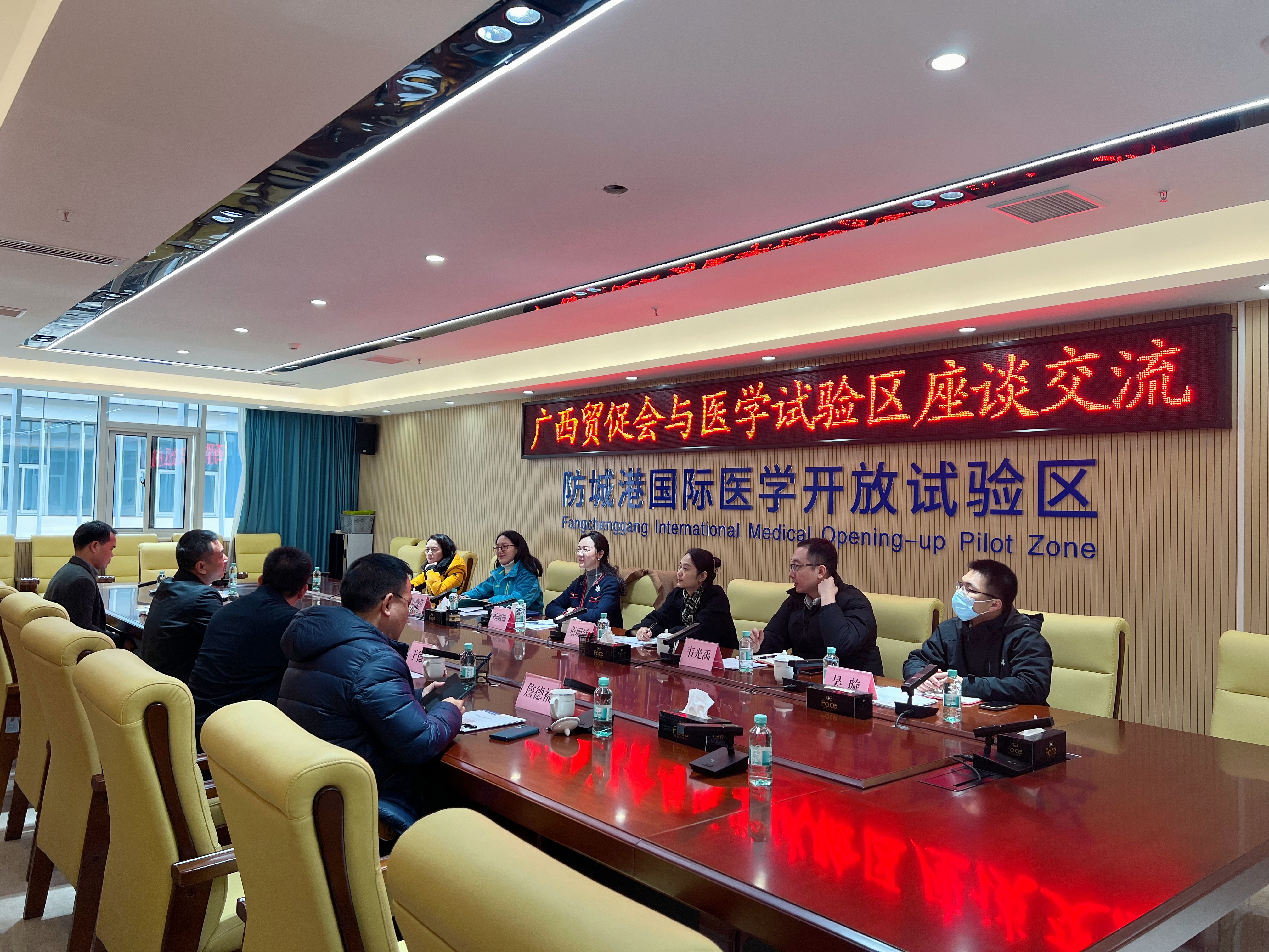 防城港市贸促会会长于德林,医学试验区工作办、高新区管委会副主任黎波,广西贸促会贸易投资促进部、合作发展部有关同志参加调研座谈。