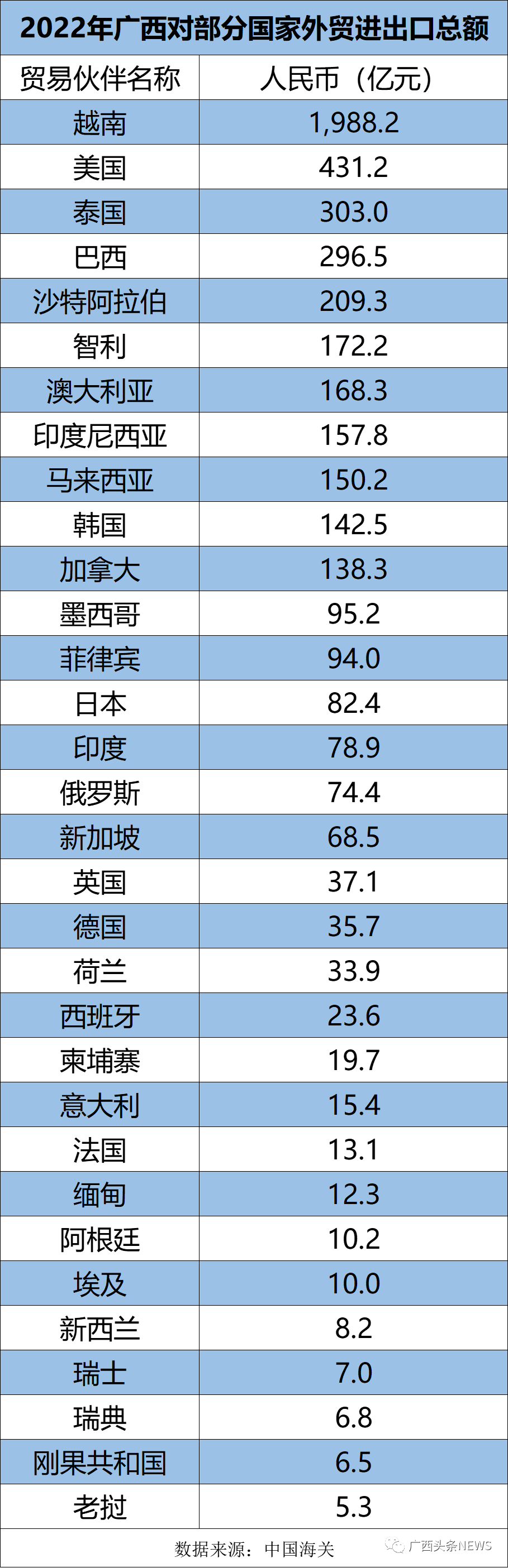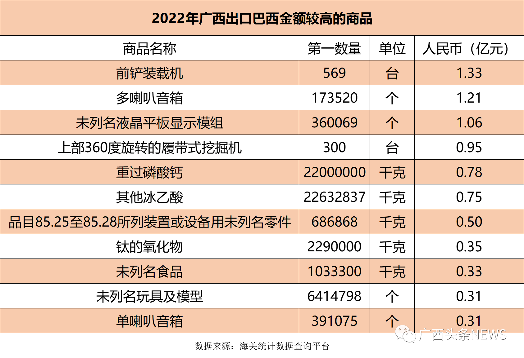 海关数据显示,2022年广西对巴西外贸进出口总额为296.5亿元,其中,进口278.34亿元,出口18.20亿元。
