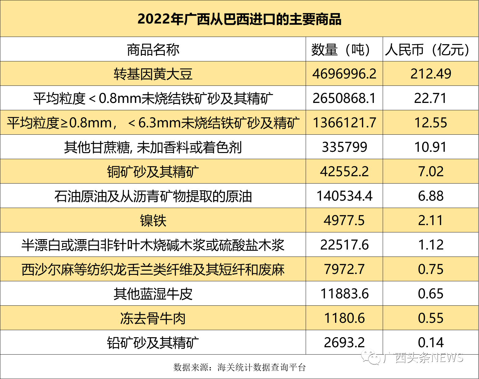 此外,巴西矿产资源丰富,有着世界上最大的铁矿石生产和出口商——巴西淡水河谷公司。无论是高铁、高速公路的建设,还是房地产开发,都离不开大量的钢材、钢筋等原材料。而从上述表格也可看出,2022年,广西进口的矿产类商品数量也十分庞大。