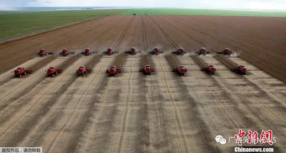 资料图:巴西库亚巴,工人们收获大豆。