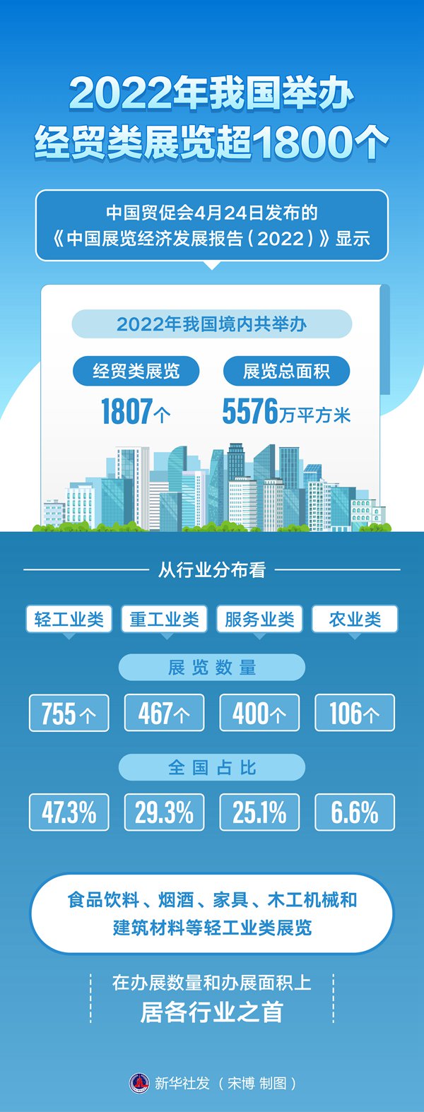 中国贸促会24日发布的《中国展览经济发展报告(2022)》显示,2022年我国境内共举办经贸类展览1807个,展览总面积5576万平方米,进博会、广交会、服贸会、消博会等重大展会,为各国搭建起共享机遇、扩大交流的国际合作平台。