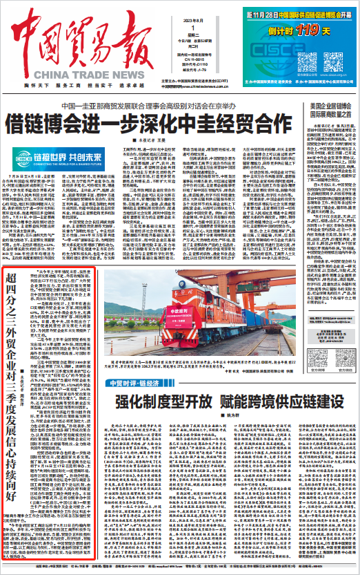 三是中国贸促会近期对3100余家外贸企业开展了深入调研。调研数据显示,对2023年三季度发展表示“信心稳定不变”及“较有信心”的外贸企业占75.1%。被问及“当前对外贸企业生产经营的利好因素”时,57.2%的外贸企业选择了“海外客户一直稳定”,55.5%的外贸企业选择“国家稳外贸政策效果好,地方政府扶持力度大”。除此之外,还存在跨境电商等贸易新业态发展迅猛、RCEP红利显现等利好因素。