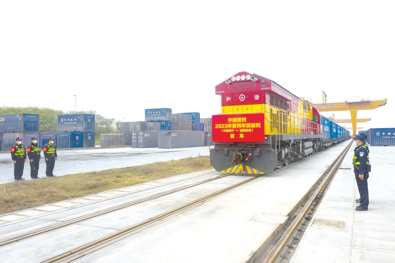 2023年1月19日12时,一趟满载黑木耳、风味蘑菇、糖果、啤酒等特色食品以及日用品等货物的X9101次中越班列从南宁国际铁路港驶往越南安员站。这是今年广西开行的首趟中越年货班列,也是RCEP生效实施以来广西开行中越班列265列。除了此次发往越南的年货班列,元月以来越南发往广西的中越班列也有7列。