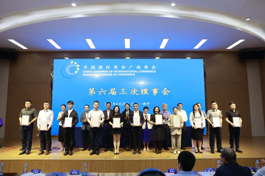 会议通过了新增副会长及理事候选名单,为14家副会长单位、17家理事单位授牌。其中,昌林集团和北海绩迅科技公司等副会长单位深耕欧美多年,实力雄厚, 他们的加入,为广大会员带来了新的国际合作渠道和机遇。广西国际商会将“踔厉奋发启新程、笃行不怠再扬鞭”,推动商会事业发展壮大。会上,钦州市国际商会代表、贵港市国际商会代表、广西国际商会产业投资协会、南宁市农产品交易中心有限责任公司作工作经验交流发言。