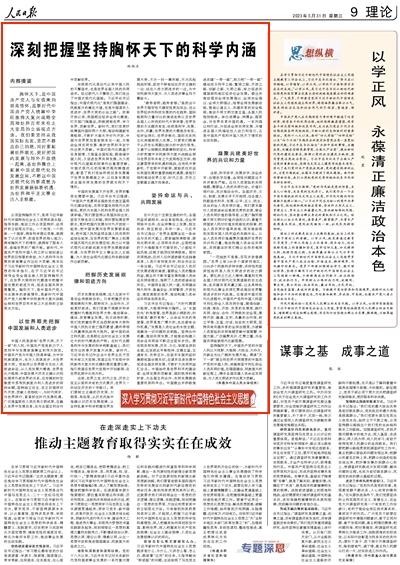 胸怀天下,是中国共产党人与生俱来的崇高情怀,是新时代中国共产党人统筹中华民族伟大复兴战略全局和世界百年未有之大变局的立场观点方法。我们要坚持从我国实际出发,坚定不移走自己的路,同时要拓展世界眼光,更好把国内发展与对外开放统一起来,在世界舞台上拓展中国式现代化的发展空间,不断以中国式现代化的新成就为世界发展提供新机遇、为世界和平正义事业注入正能量。