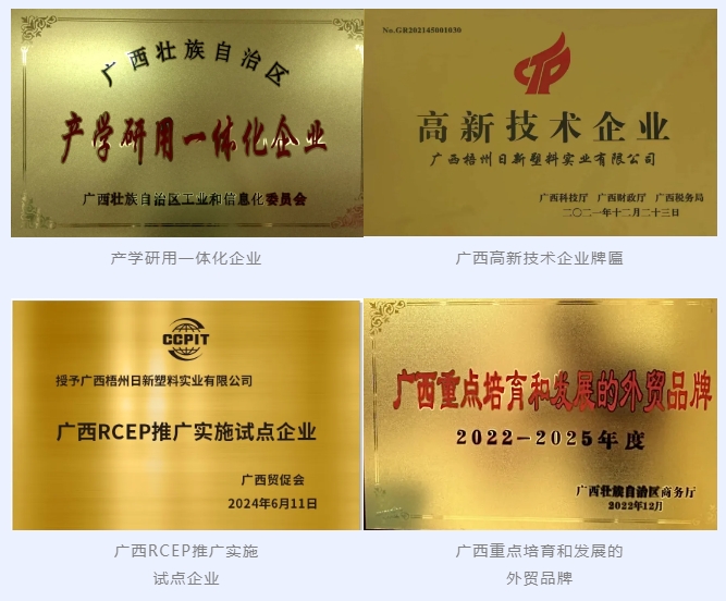 “日新”商标获2007-2010、2010-2013、2013-2016、2013-2016年广西著名商标、广西名牌产品、广西知名商品、2016年广西出口名牌。公司产品“日用塑料晒衣架”入围2022年《广西名优工业产品推荐目录(第二批)》,通过SO900质量管理体系认证。公司先后被授予广西企业技术中心、广西产学研用一体化企业、广西知识产权优势企业培育单位、广西民营企业文化建设示范单位、梧州市安全生产标准化三级企业,拥有4项产品发明专利、3项产品外观设计专利、18项实用新型专利。2018-2021、2022-2024年广西高新技术企业。2020-2023年广西“专精特新”中小企业。2024年6月获广西贸促会授予“广西RCEP推广实施试点企业”。